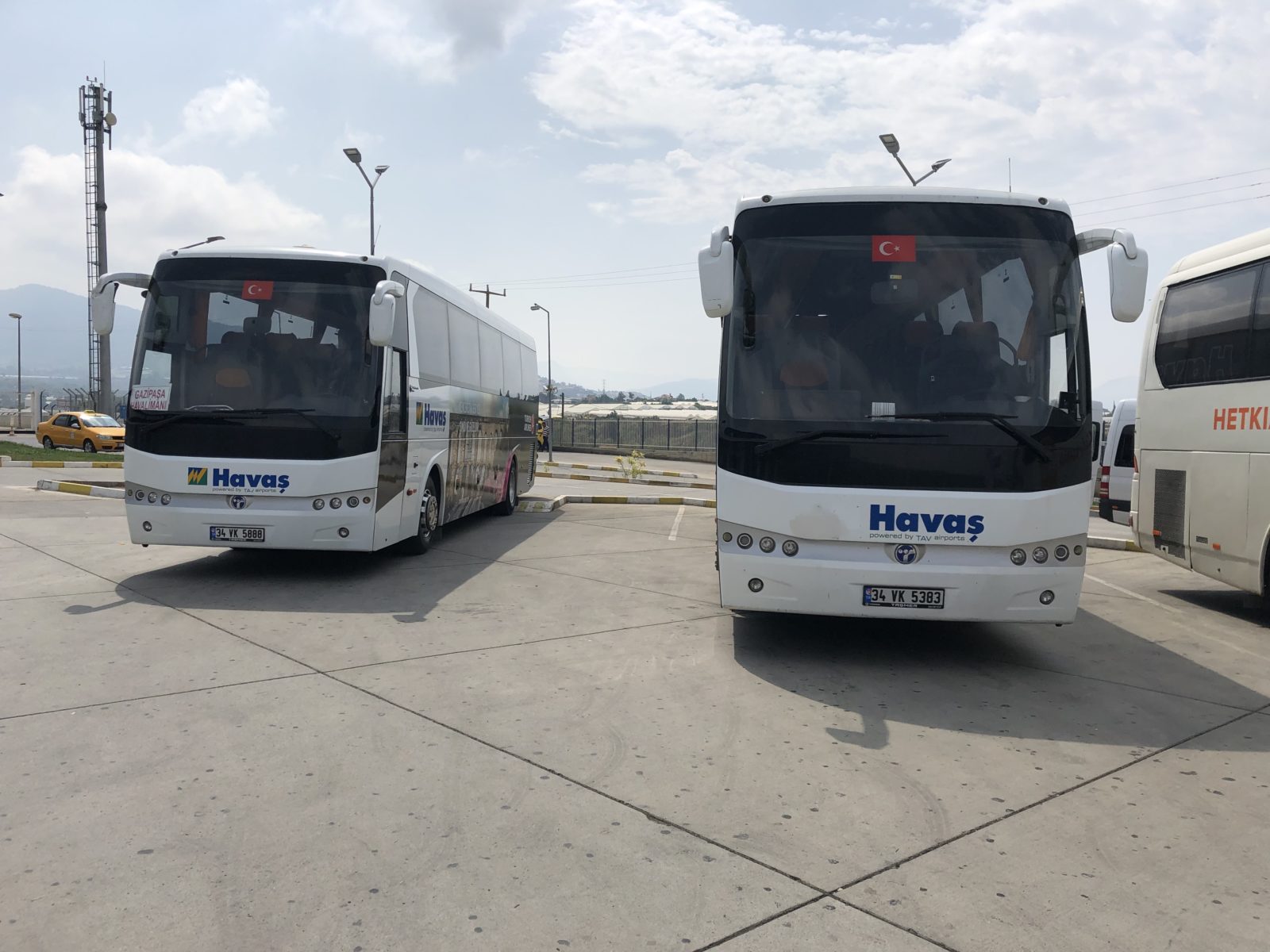 ? Автобусы стоят прямо на выходе из аэропорта, их невозможно не заметить. Стоимость проезда на автобусе — 20 лир (около 220 рублей).