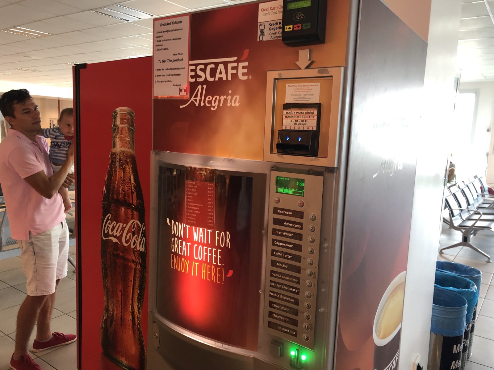 Перекусить можно около зала регистрации и в зоне посадки. Около регистрации работает столовая Kantin, где есть горячее, салаты, супы. В зоне ожидания нормально поесть уже не получится — в местном кафе в меню только сэндвичи, закуски, картофель фри и напитки. Цены на еду начинаются от 23 лир за тост с сыром. Зато в кафе есть много зарядок и мягкие кресла — можно с комфортом дождаться самолёта за чашкой кофе и зарядить свою технику. Также можно купить кофе или газировку в автоматах в зоне ожидания. На втором этаже аэропорта Алании работает VIP-зал, в котором можно отдохнуть, почитать свежие газеты, провести переговоры в конференц-зале на 20 человек и посидеть в баре. Зал работает круглосуточно. Стоимость составляет 20 евро со взрослого, дети до 12 лет бесплатно. Также посетители аэропорта могут обменять валюту в терминале. Необязательно делать это в пункте обмена валют, можно просто снять деньги со своей карты в местном банкомате сразу в лирах.