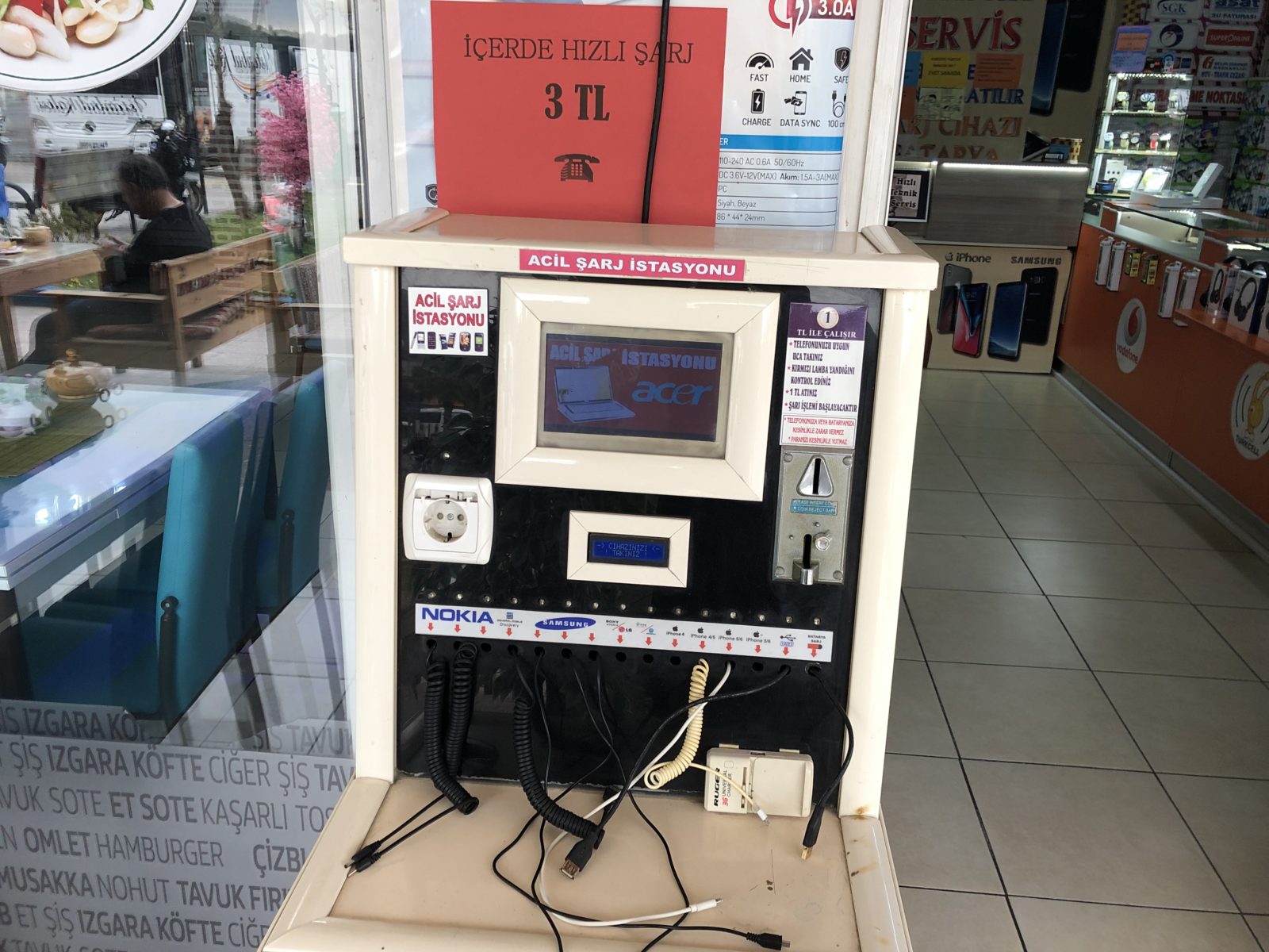 Можно зарядить любой телефон — от Samsung до iPhone. Это стоит 3 лиры. Во время подзарядки лучше находиться рядом с телефоном— на вокзале много туристов, и его могут забрать. Если не успели зарядить — не переживайте, в автобусах есть розетки, которые работают всё время, что вы в пути. Это бесплатно.