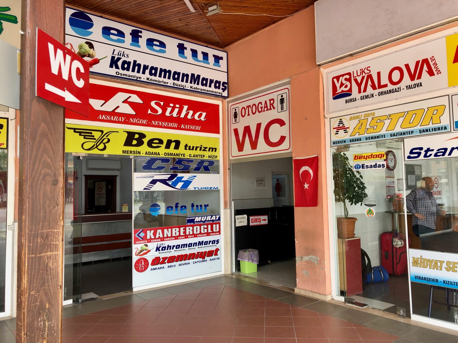 На автовокзале есть платный туалет — стоит 1,5 лиры. Внутри есть турецкие туалеты — с отверстием в полу — и более привычные нам унитазы. Это указано на дверях кабинок.